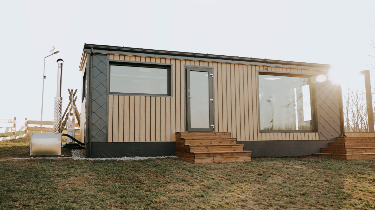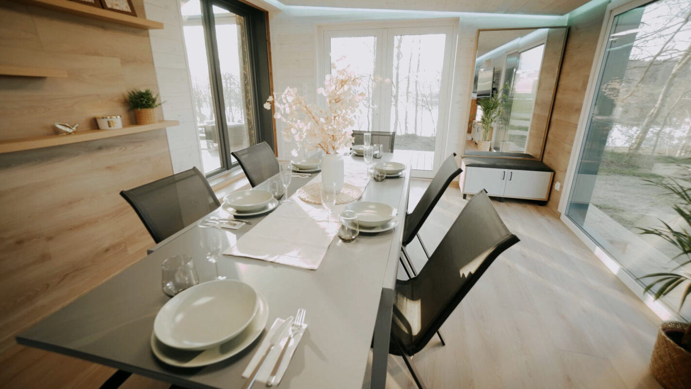 Może funkcjonować jako samodzielna konstrukcja lub jako rozszerzenie domu mobilnego, tworząc spójną, powiększoną przestrzeń użytkową.