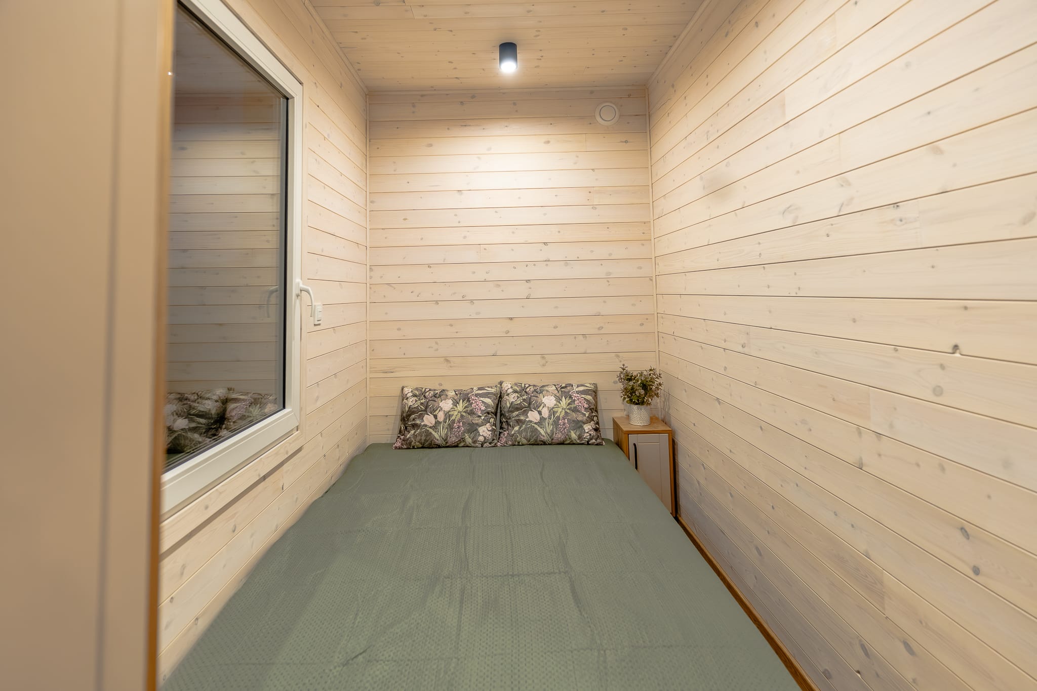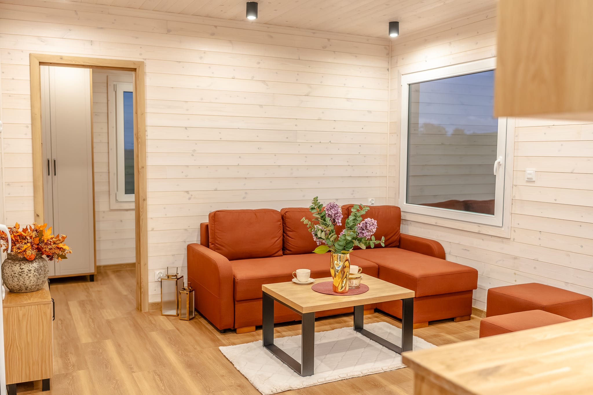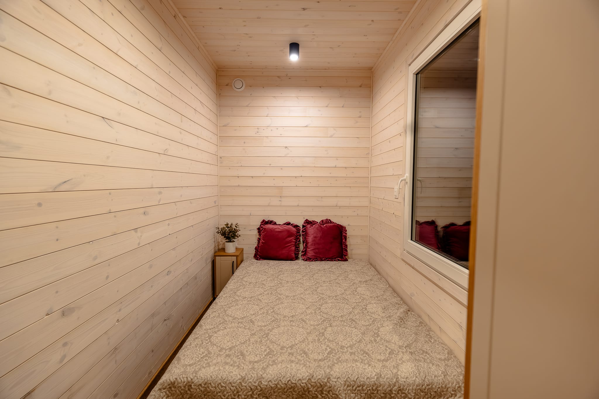 W środku czeka jasna, dobrze zorganizowana przestrzeń, którą można dostosować do własnych potrzeb — od układu z dwiema sypialniami po wariant rodzinny z trzema oddzielnymi pokojami. Dzięki temu Jagoda 40 Premium sprawdza się zarówno jako prywatny azyl dla pary, jak i praktyczny domek dla rodziny.