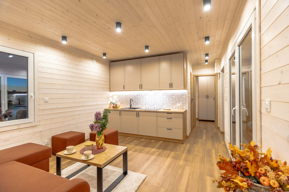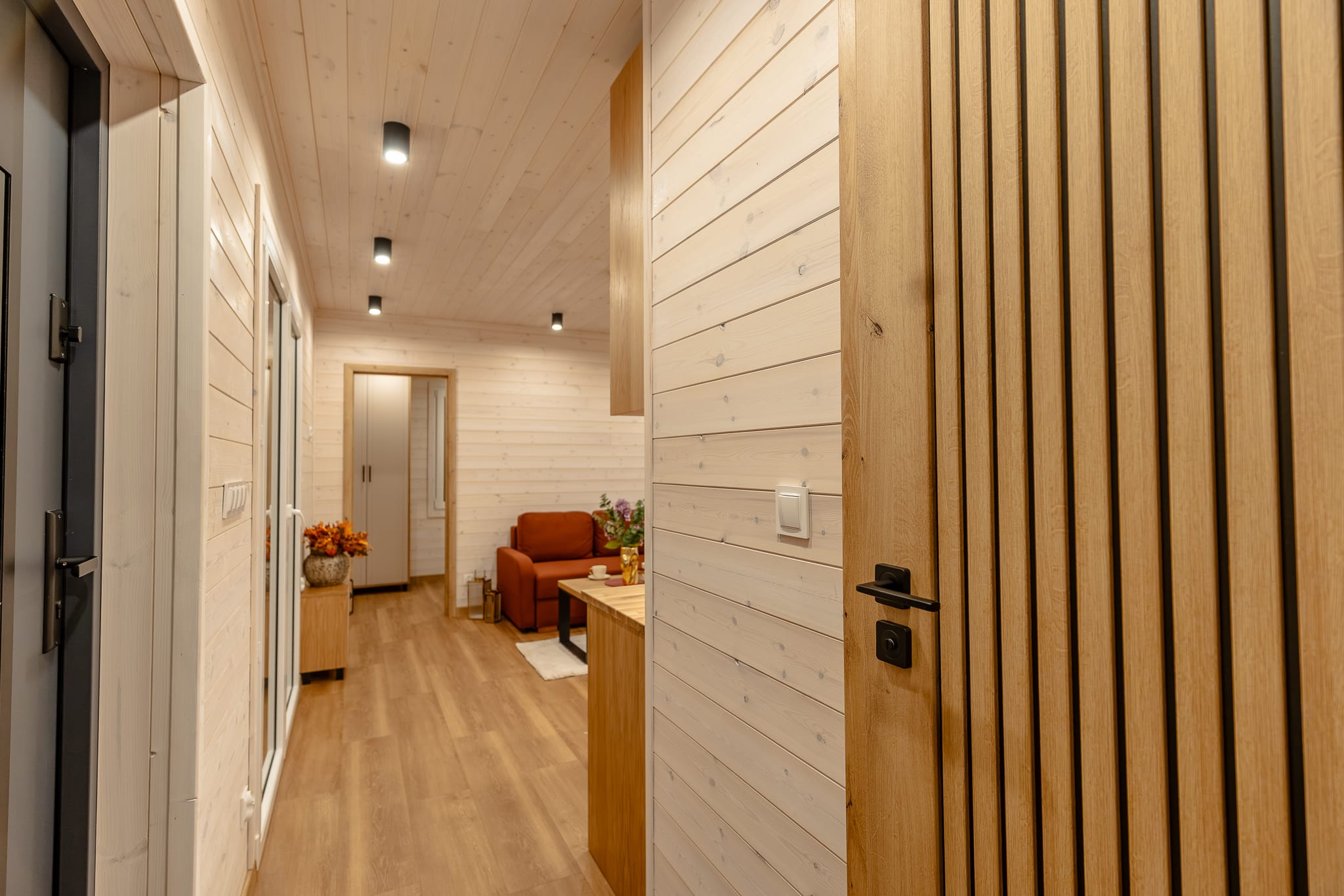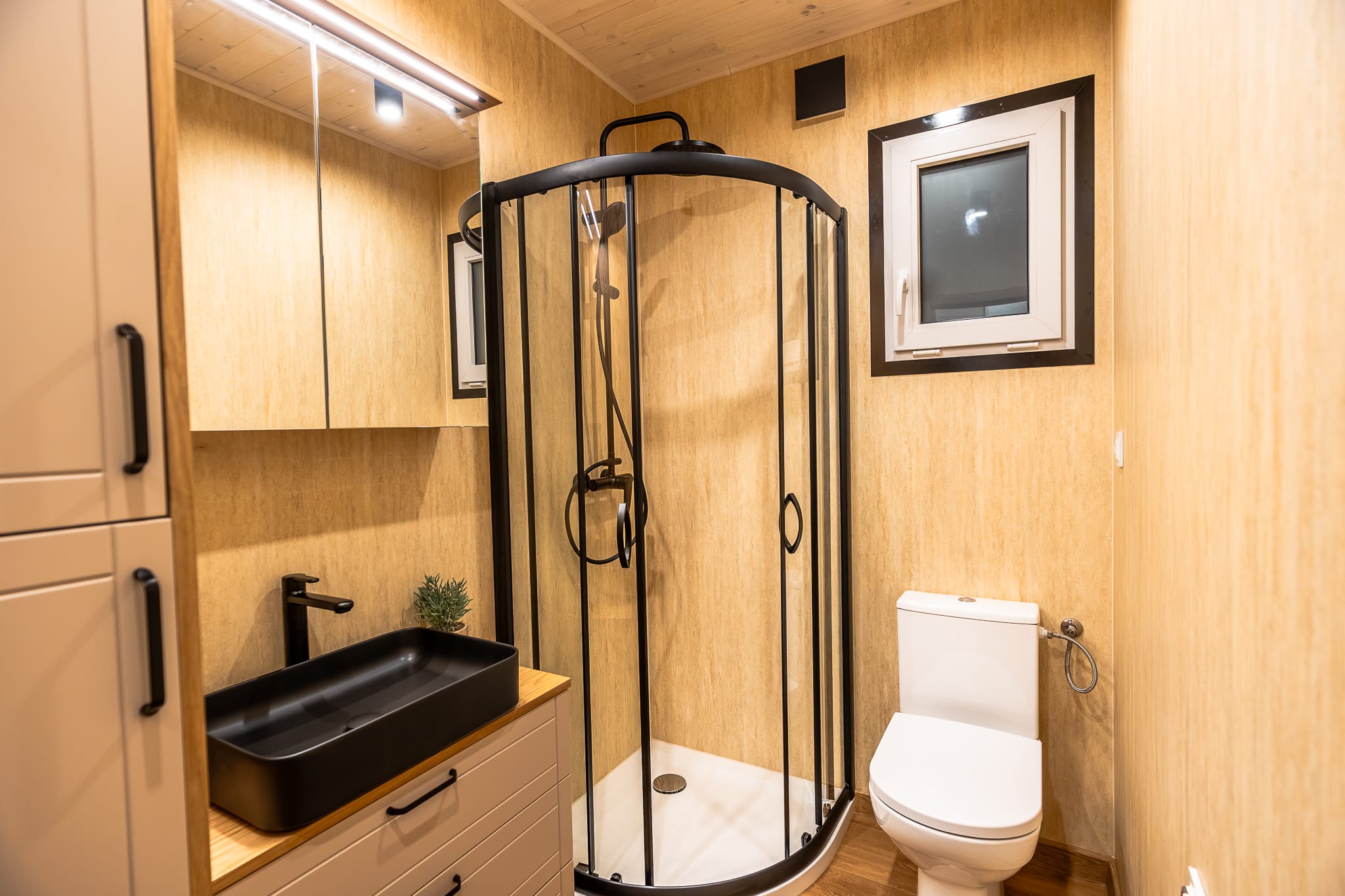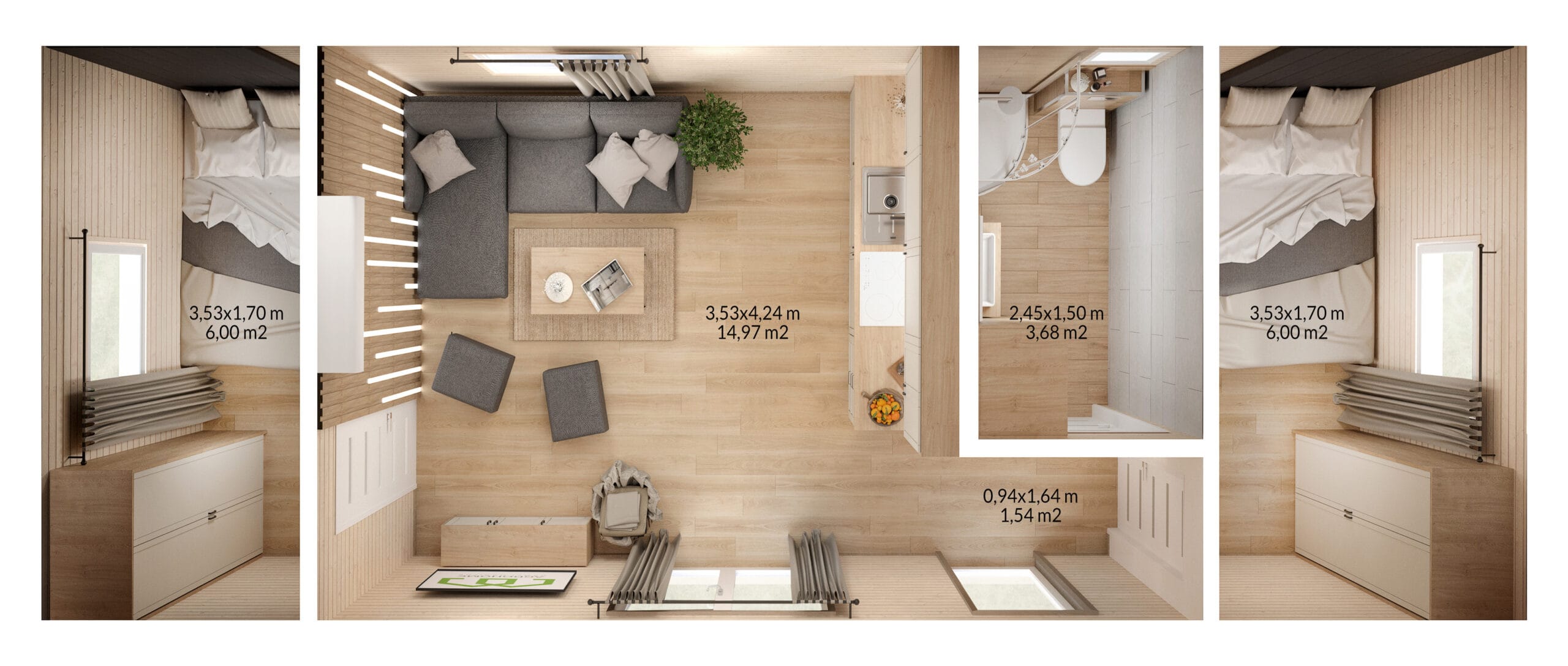 W środku czeka jasna, dobrze zorganizowana przestrzeń, którą można dostosować do własnych potrzeb — od układu z dwiema sypialniami po wariant rodzinny z trzema oddzielnymi pokojami. Dzięki temu Jagoda 40 Premium sprawdza się zarówno jako prywatny azyl dla pary, jak i praktyczny domek dla rodziny.